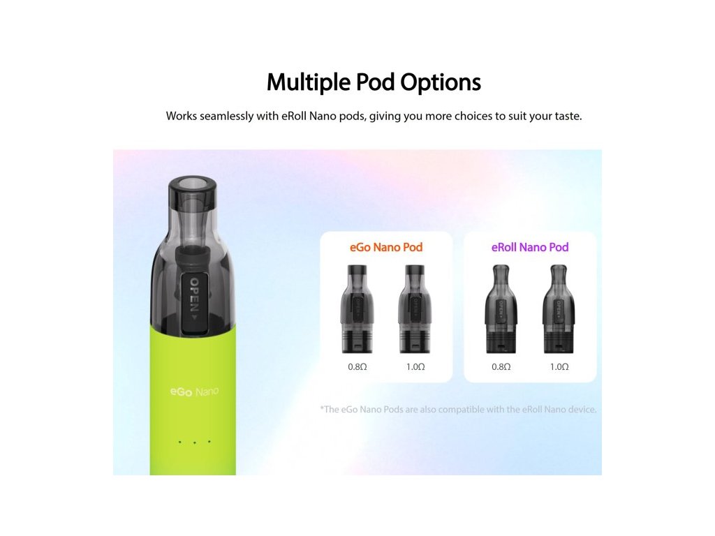 Podporuje více variant podů (0.8Ω a 1.0Ω), takže si můžete přizpůsobit potah podle svých preferencí. S rychlým USB-C nabíjením a 2ml plnitelnou cartridgí je eGo Nano ideálním společníkem jak pro začátečníky, tak pro zkušené uživatele.