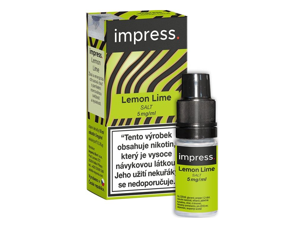 Liquid IMPRESS SALT Lemon Lime 10ml s 5mg nikotinové soli nabízí osvěžující citrusový zážitek bez dráždivého pocitu v krku. Perfektní volba pro milovníky ovocných příchutí.