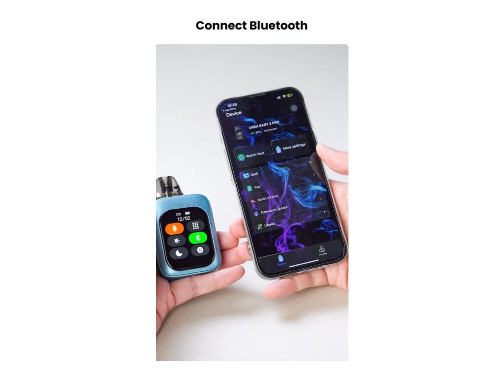 Zařízení podporuje Bluetooth 5.0, což umožňuje chytré propojení a personalizaci nastavení. Kompatibilita s celou řadou Ursa cartridgí poskytuje široký výběr pro různé styly vapování. Elegantní tělo z odolné zinkové slitiny je lehké a snadno přenosné, což z něj činí ideálního společníka na cesty.