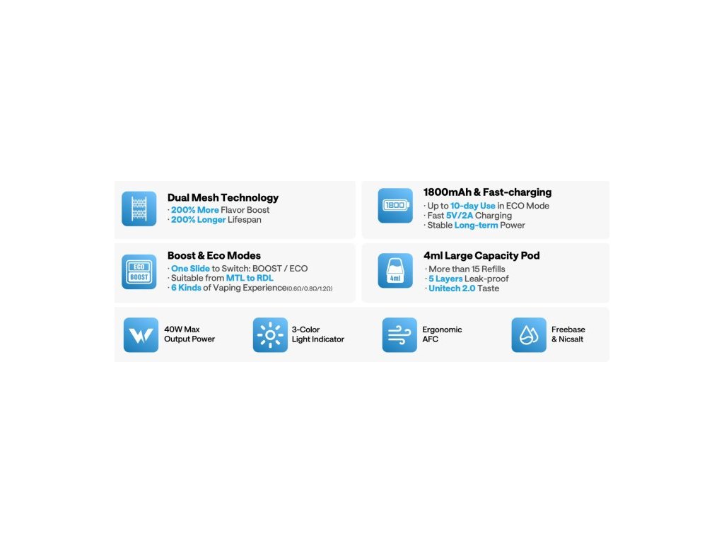 Technologie Dual Mesh zvyšuje chuť a životnost cartridge až o 200 % ve srovnání s běžnými modely. S možností přepínání mezi režimy BOOST a ECO si můžete přizpůsobit vaping podle svých preferencí, a to v šesti různých variantách (0.6Ω / 0.8Ω / 1.2Ω), vhodných pro MTL i RDL styl.