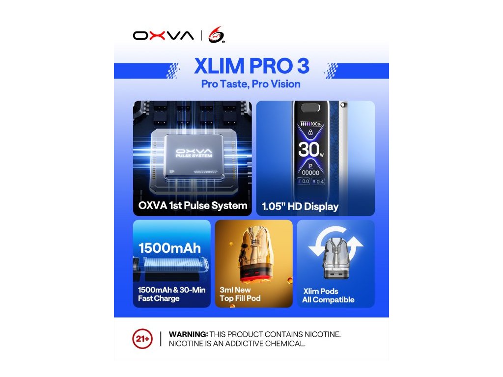 OXVA Xlim Pro 3 je navržen pro maximální pohodlí a přizpůsobení. Inovativní TOP-FILL pod cartridge ve variantách 0.6Ω a 0.8Ω umožňují snadné plnění a přizpůsobení stylu potahu. Ergonomické boční airflow zajišťuje přesné nastavení průtoku vzduchu podle vašich preferencí. Velký 1.05" HD displej přehledně zobrazuje všechny důležité informace, jako je stav baterie a výkon.