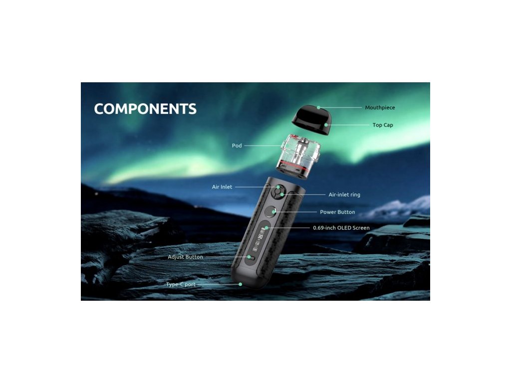 Na přední straně zařízení se nachází přehledný OLED displej, který umožňuje snadné nastavení hodnot a zobrazuje všechny potřebné informace. Tvorbu páry zajišťuje nejen spínací tlačítko, ale i systém automatického žhavení - stačí pouze potáhnout z náustku.