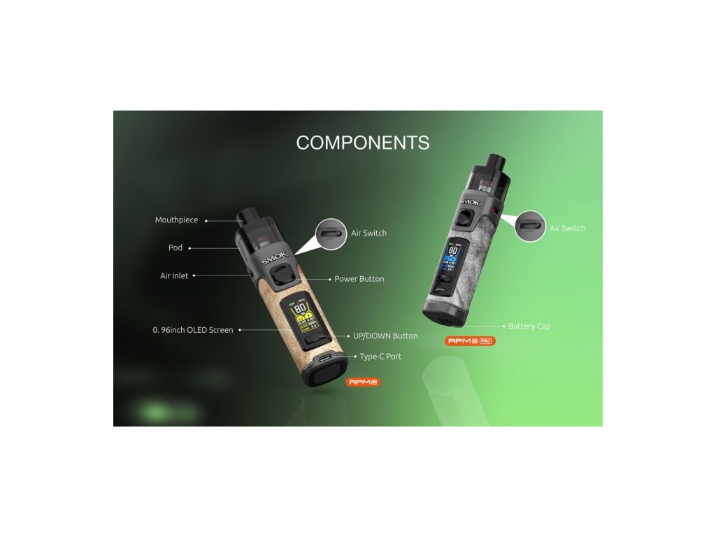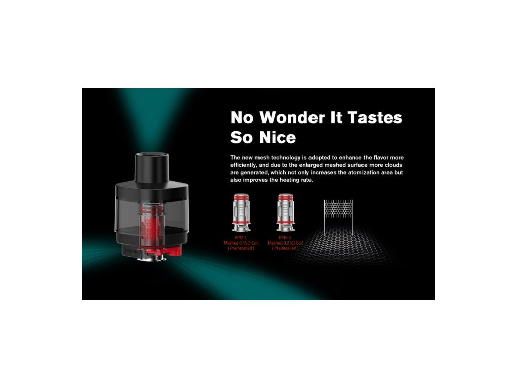 Mezi jeho další přednosti patří ochrana proti zkratu, přehřátí a podbití, či osmi vteřinová ochrana žhavení. Cartridge jsou vybaveny novými žhavícími hlavami RPM 3, které lze jednoduše vyměnit. Uživatelsky přívětivé vrchní plnění pojme až 6,5ml Vašeho oblíbeného liquidu. V základním balení budete mít na výběr dvě žhavící hlavy, a to Meshed o odporu 0,15ohm a 0,23ohm. Regulace přívodu vzduchu pro nastavení optimální kouřivosti se nachází ve vrchní části.