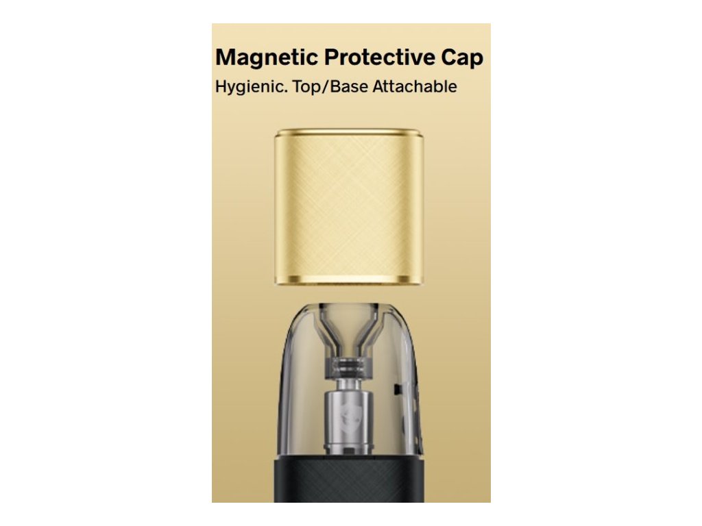 Cartridge s horním plněním o objemu 3ml je navržena tak, aby zabránila úniku e-liquidu a zůstala čistá po dobu až 30 dní. Magnetické ochranné víčko chrání náustek při přenášení a lze jej pohodlně připnout na spodní část zařízení během používání. Ergonomický design z hliníkové slitiny zajišťuje lehkost a styl.